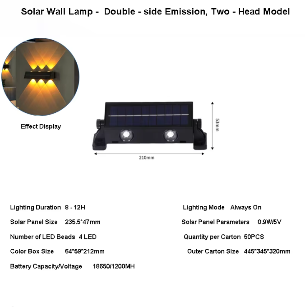 امنح واجهة منزلك أو حديقتك لمسة أنيقة وموفرة للطاقة مع أبليك الجدار الخارجي العامل بالطاقة الشمسية. صُمم هذا الأبليك ليوفر إضاءة ديكورية راقية ثنائية الاتجاه (أعلى وأسفل)، مما يخلق خطوط ضوء جذابة على جدارك دون الحاجة لأي تمديدات كهربائية.