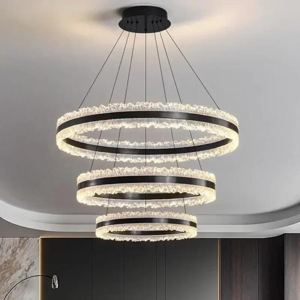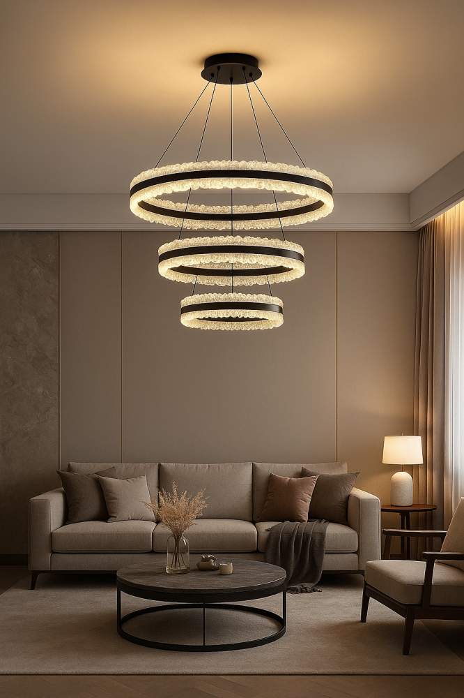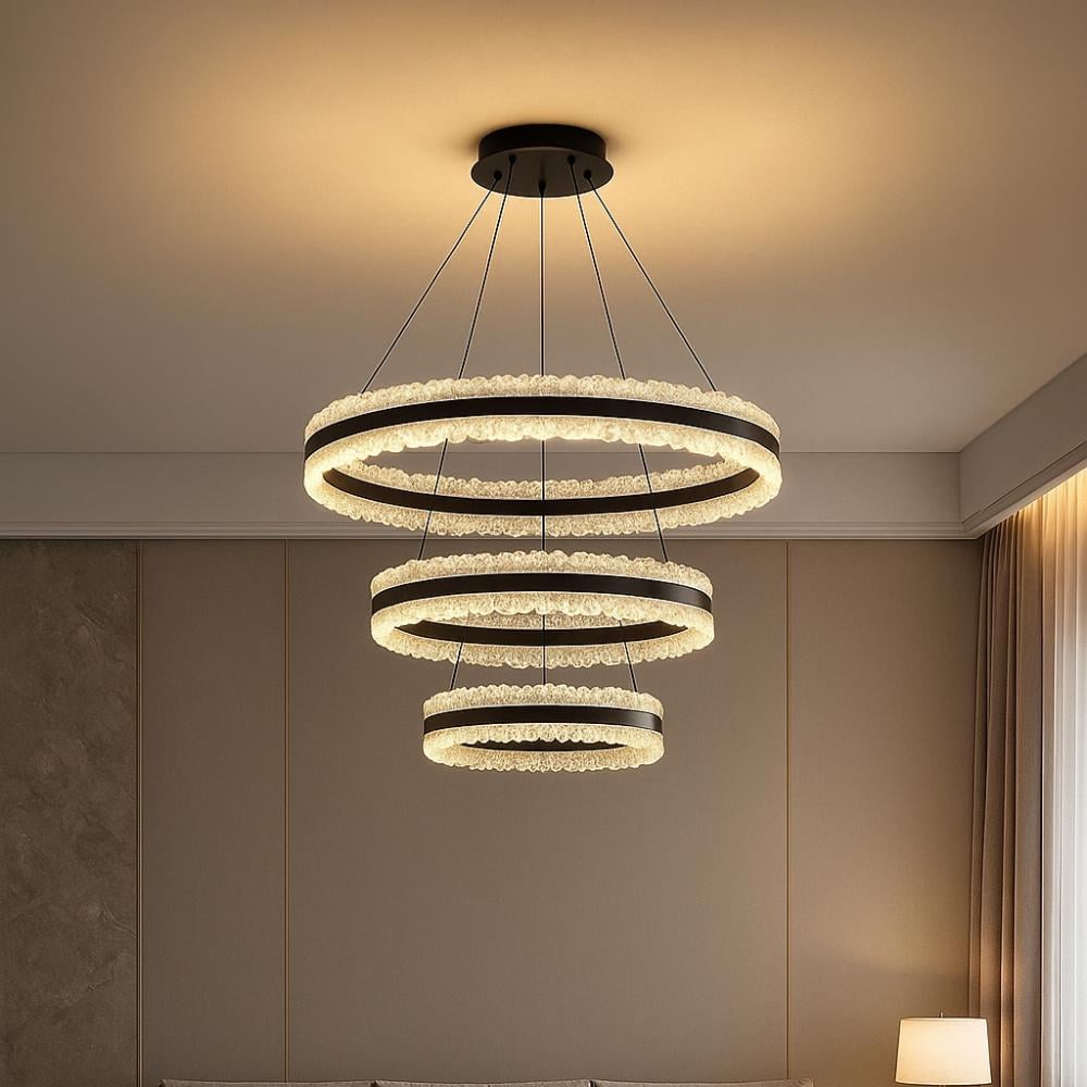 - تصميم مودرن مبتكر بثلاث طبقات باللون الأسود: تُضفي الثريا لمسة عصرية فريدة على سقفك بفضل تصميمها الهندسي المكون من ثلاث طبقات متتالية باللون الأسود الفاخر. يخلق هذا الشكل الديناميكي بعداً بصرياً جذاباً ويجعل الثريا قطعة فنية مركزية تبرز جمال أي غرفة بتناغم مثالي.