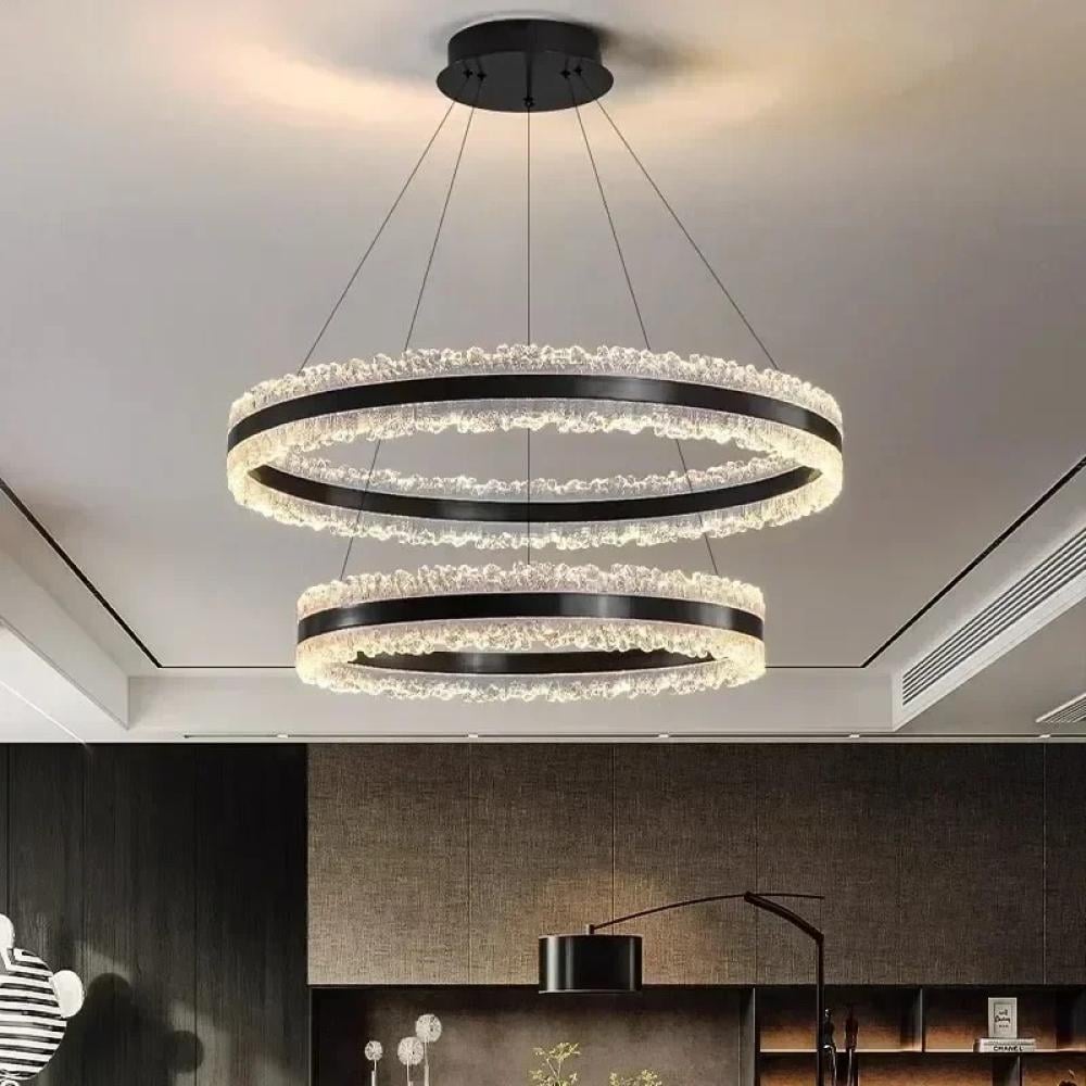 - تصميم مودرن مبتكر بثلاث طبقات باللون الأسود: تُضفي الثريا لمسة عصرية فريدة على سقفك بفضل تصميمها الهندسي المكون من ثلاث طبقات متتالية باللون الأسود الفاخر. يخلق هذا الشكل الديناميكي بعداً بصرياً جذاباً ويجعل الثريا قطعة فنية مركزية تبرز جمال أي غرفة بتناغم مثالي.