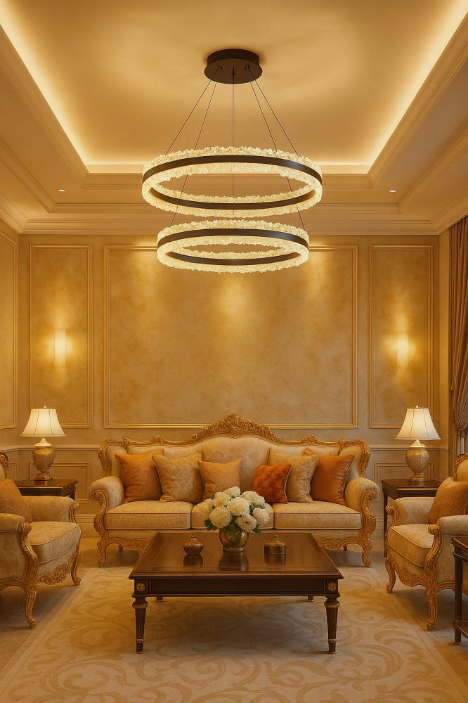 - غرف المعيشة والصالونات الفسيحة: كقطعة مركزية تضيء المساحة الكبيرة وتوفر أجواءً متعددة.