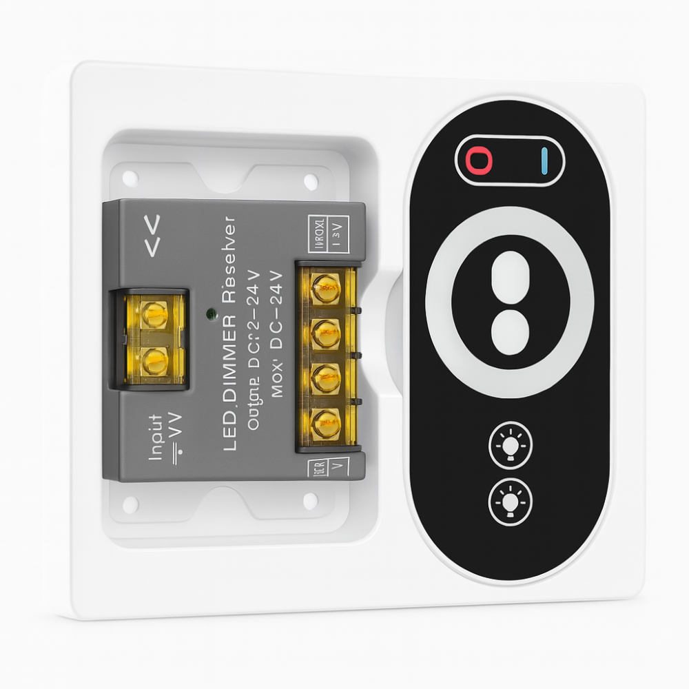 جهاز ديمر مصمّم خصيصاً للتحكم بسلاسة في إنارة الزينة وشريط الـLED بجهد 12 – 24 فولت، عبر وحدة تحكّم لاسلكية (ريموت) مريحة وسهلة الاستخدام.