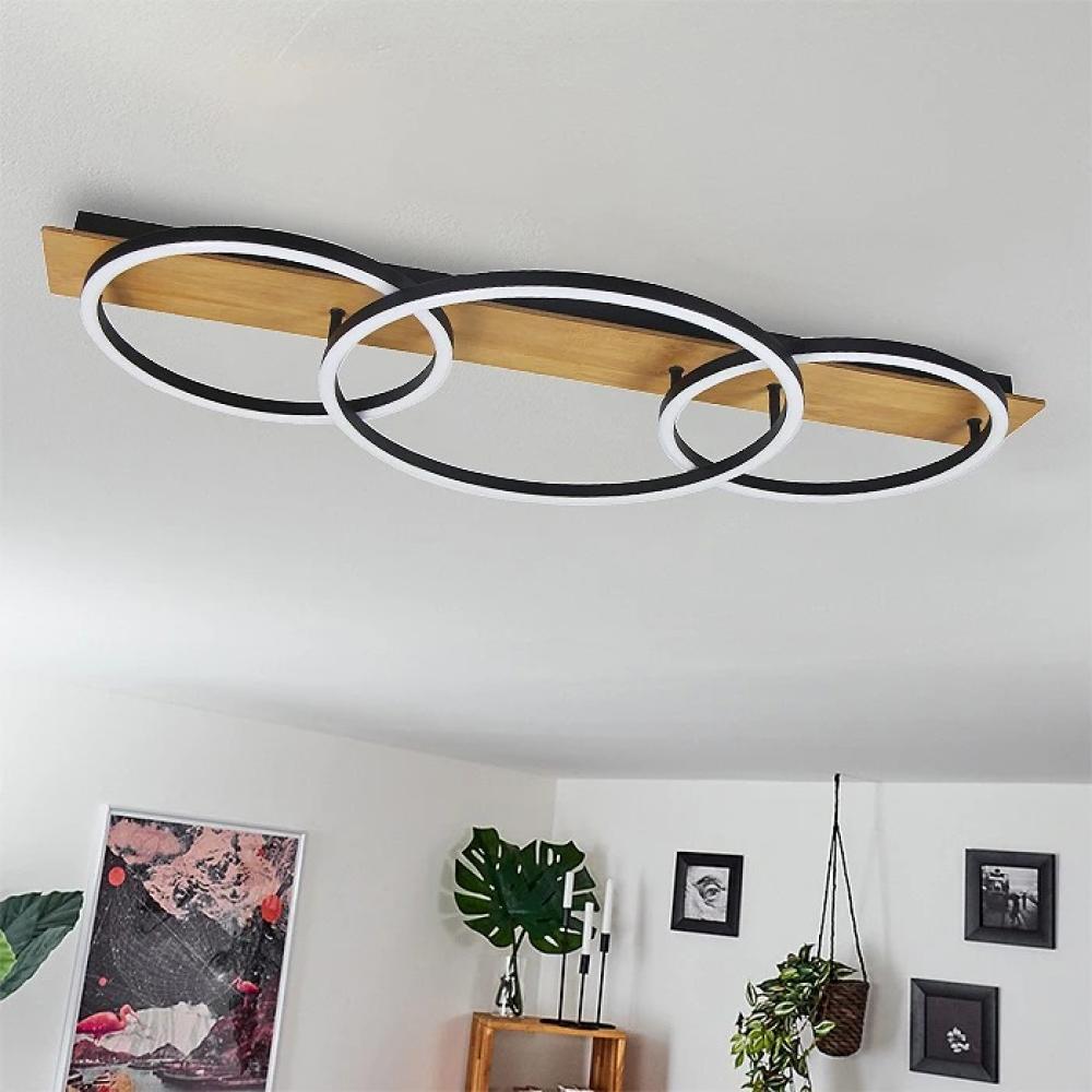 - تصميم خشبي عصري بحلقات LED: يتميز بشكل حلقات هندسية متداخلة، تجمع بين الدفء الطبيعي للخشب ومتانة الألومنيوم، مع إضاءة LED مدمجة تبرز خطوط التصميم بجمال. يمنحك مظهراً أنيقاً ومميزاً يتماشى مع أحدث صيحات الديكور.